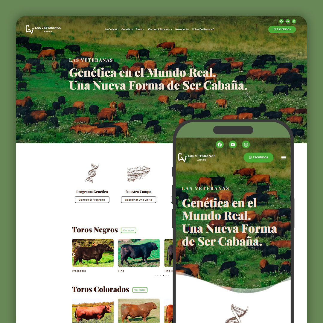 Sitio web para la Cabaña Angus Las Veteranas. Una página institucional y showroom toros y vacas madre y genéticas para la crianza de ganado Angus en la región serrana central de la provincia de Buenos Aires, Tandil.